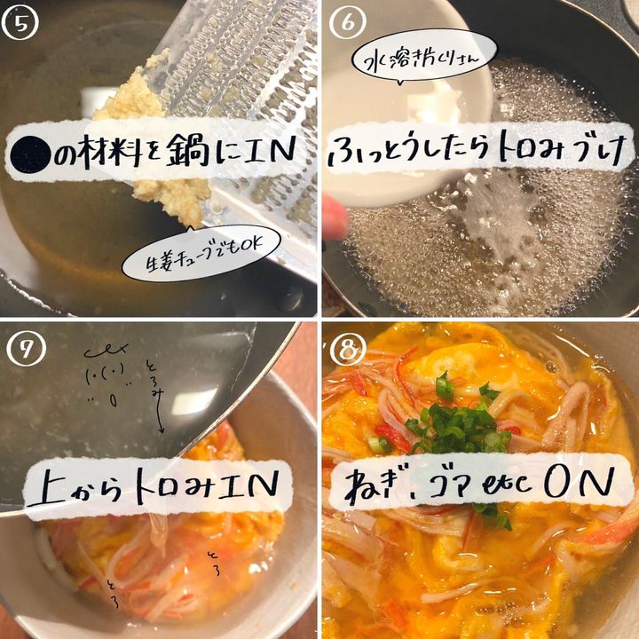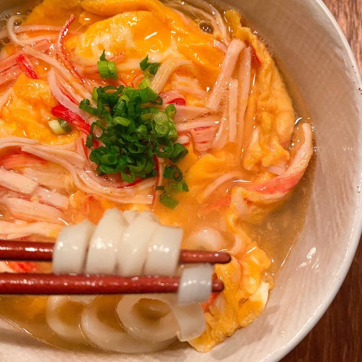 ⑦④のかに玉うどんの上からゆっくり⑥の汁を注ぐ