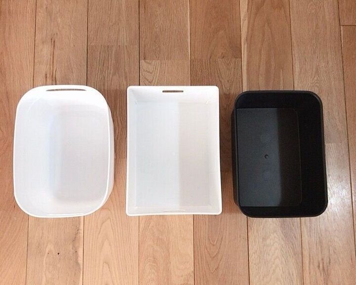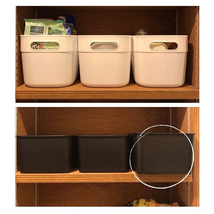 実際に我が家の例をお見せしますと、白のケースは棚に3つ収まりますが、黒のケースだと収まらないんです。