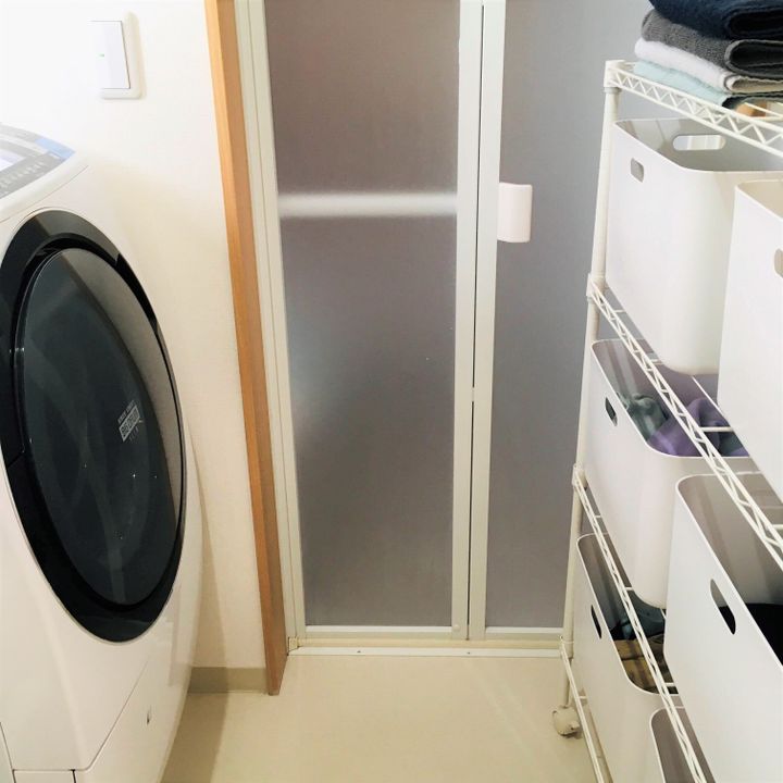 洗濯機の向かいに収納ラックを設置したことで、乾燥が終わった洗濯物を洗濯機からダイレクトに仕舞えるようになりました。
