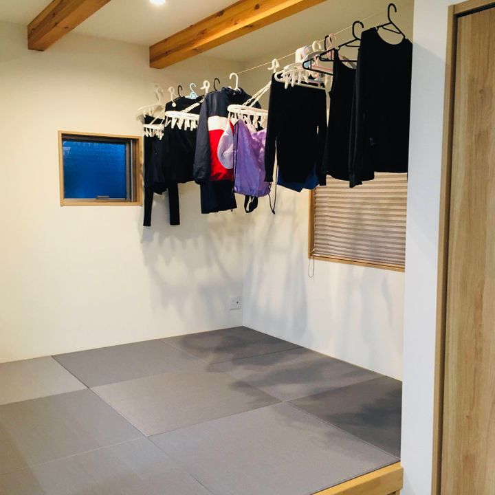 リビング奥の和室に物干しワイヤーを設置し、部屋干しスペースに。