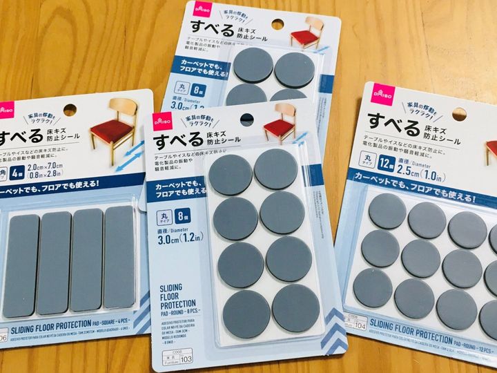家中のテーブル、椅子、ベンチの下に【すべる床キズシール】を貼っています。