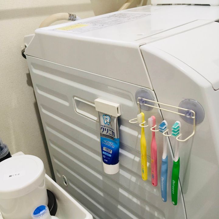 以前はタオルバーに引っかけるタイプのチューブホルダーを使っていたのですが、これならひとつで収納まで完結できます。