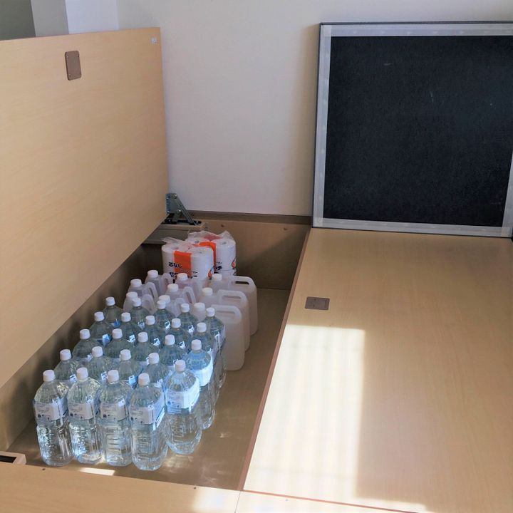 自然災害の発生に備えて、飲料水と給水タンク、トイレットロールを小上がりの和室の床下部分に収納しています。