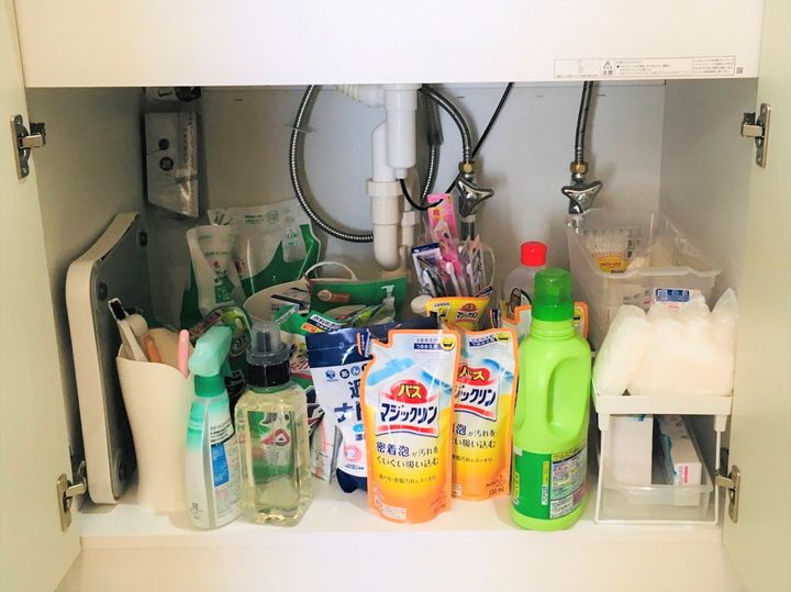 洗剤、シャンプー類の詰め替えや掃除用品、歯ブラシのストックなどが雑多に詰め込まれた洗面台下収納。
