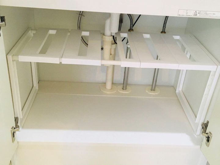 まず排水トラップの奥側に伸縮パイプを通しフレームを固定する。手前も同様に伸縮パイプを取り付ける。あとは棚板を取り付けるだけ。