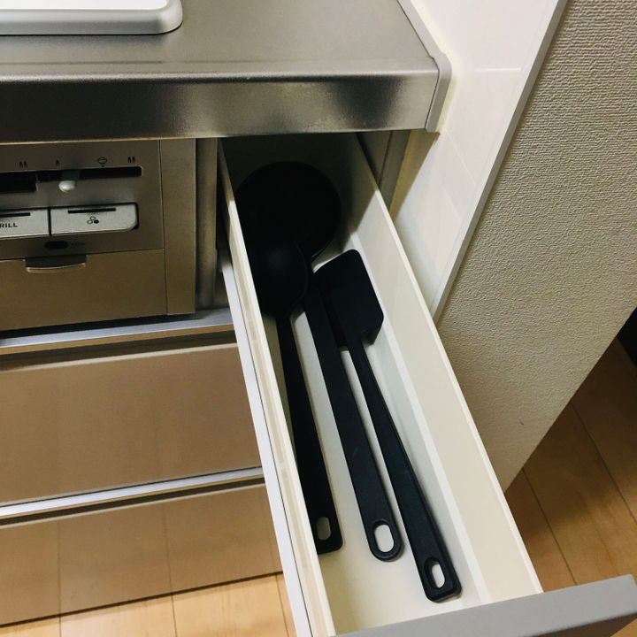 コンロ下の引出しにはお玉、調理スプーン、スパチュラを入れています。
