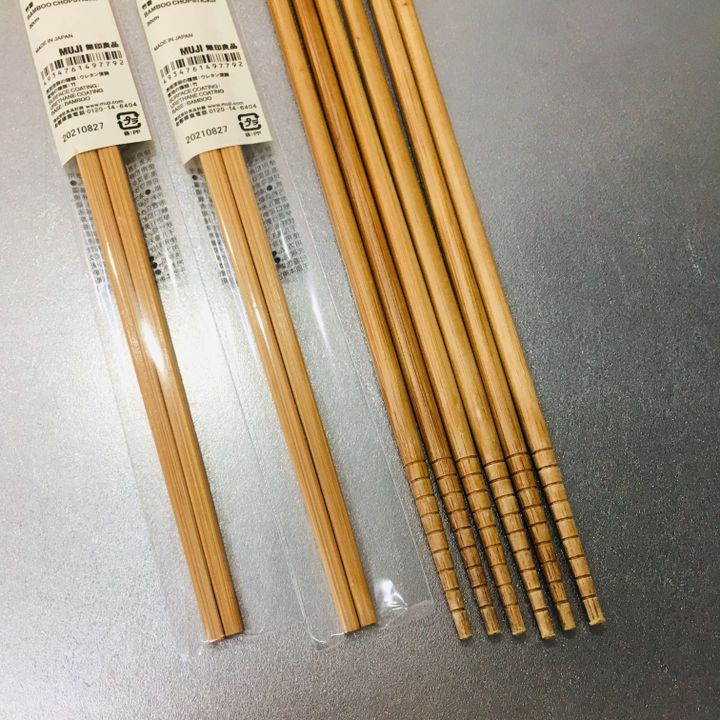 以前使っていた菜箸は溝に汚れが溜まり、何度も洗い直したりと管理が大変でしたが、【無印良品の竹箸】に変えて簡単に洗えるようになり、予備を持つ必要がなくなりました。