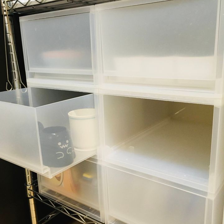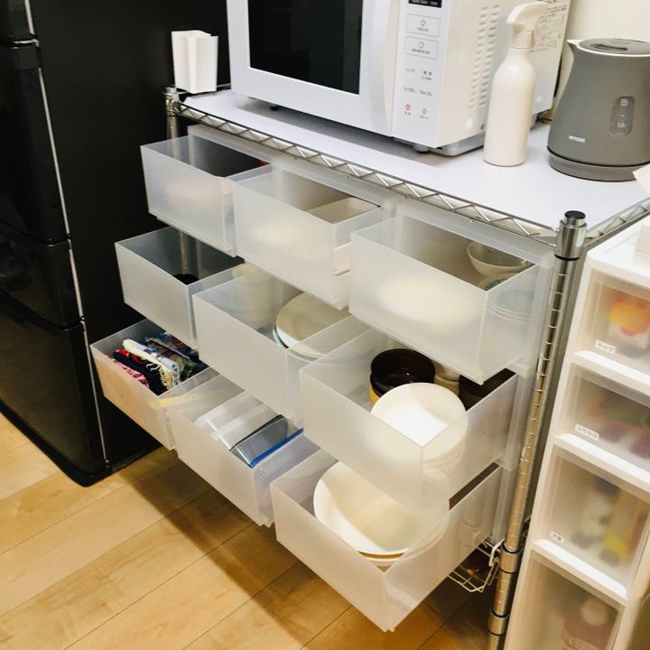 食器類は【無印良品ポリプロピレンケース・引出式・深型】にカテゴリー分けして収納しています。