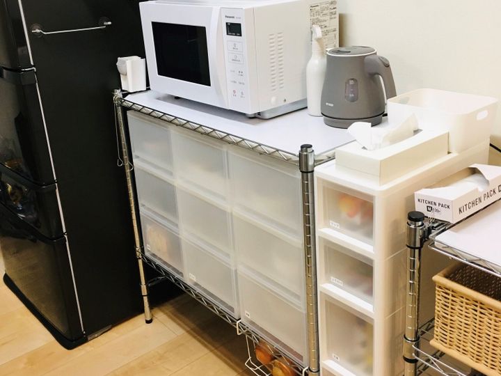 マイホームを購入したときに、キッチンメーカーのショールームをたくさん見て回りましたが、どれもピンとこず、とりあえず賃貸アパートで使っていたスチールラックを持ってきました。