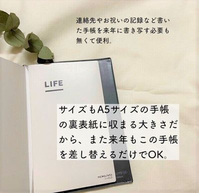 他にもあるかも知れませんが、書き換えないことは薄型手帳に差し込んで 年を超えて年間手帳が終わっても薄いサブ手帳を差し替えれば通年使えるようにしています。
