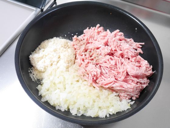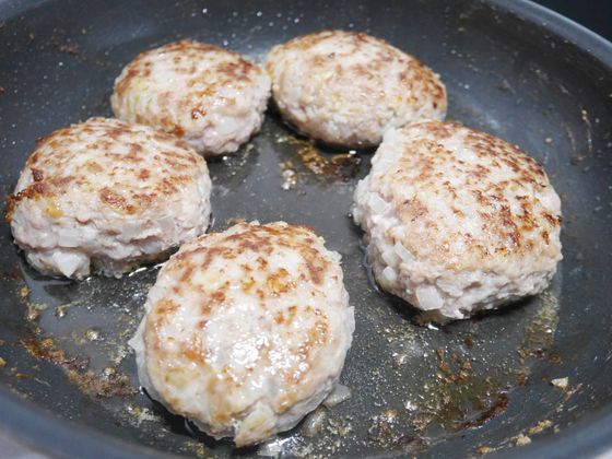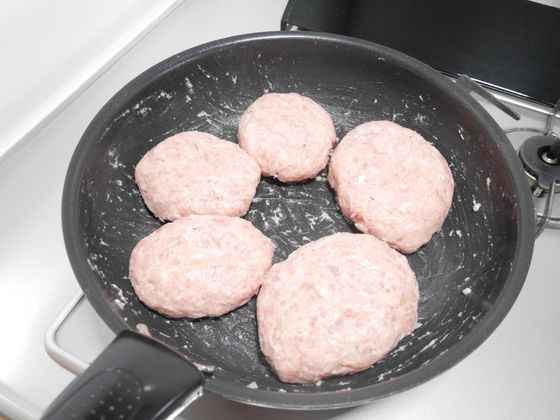 フライパンの中で肉だねをいつもの形・大きさに成形します。