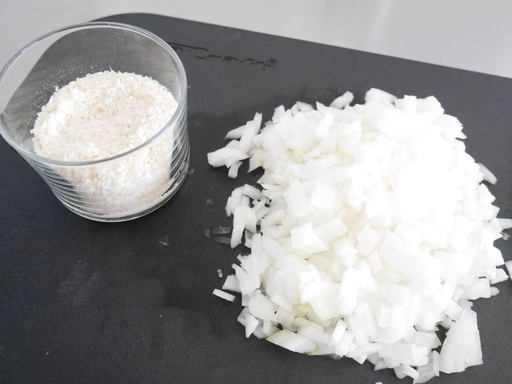玉ねぎはみじん切り、パン粉に牛乳を浸しておきます。
