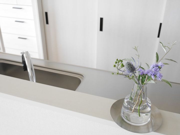 キッチンカウンターなど、キッチンからよく見える場所に花や植物を置くことで、心にゆとりが生まれて、料理へのモチベーションUPにつながりますよ。