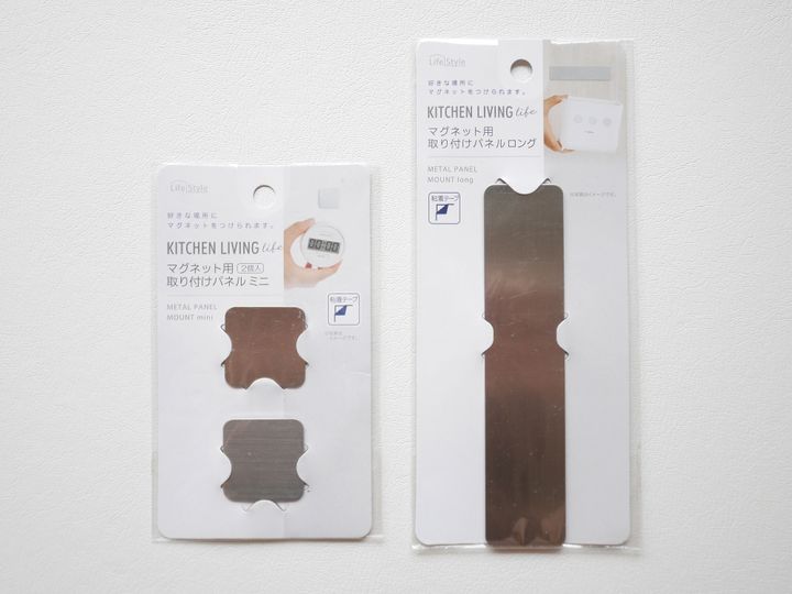 もし、「マグネット収納」したい場所にマグネットが取り付けられる場所がない場合、同じくSeriaやダイソーで取り扱いのある「マグネット用取り付けパネル」を貼り付けたら解決できます!