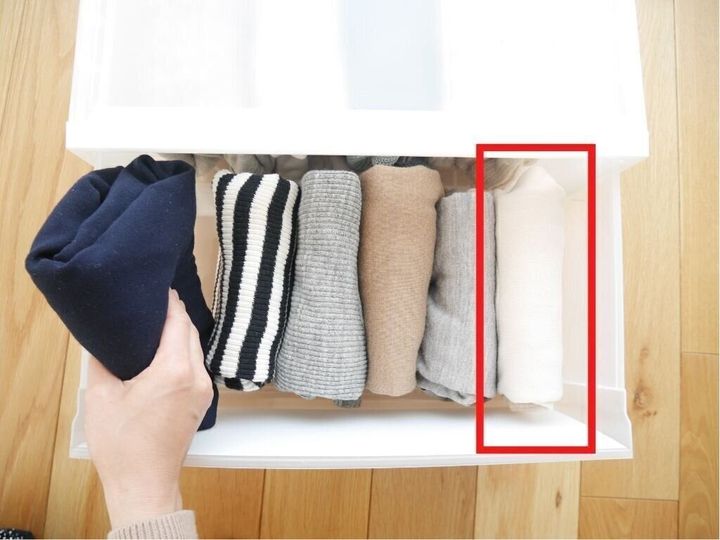 カテゴリー毎にエリアを分けて収納し、【ステップ2】のルールを続けると、各エリアの右端には自然と着ていない服が集まります。