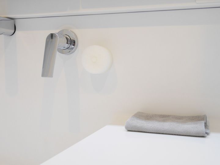 毎日使うため、どうしても汚れやすい洗面所には、濡れた洗面台を片手でサッと拭けるクロスと手洗いのついでにサッと掃除できる小さなスポンジを設置しています。