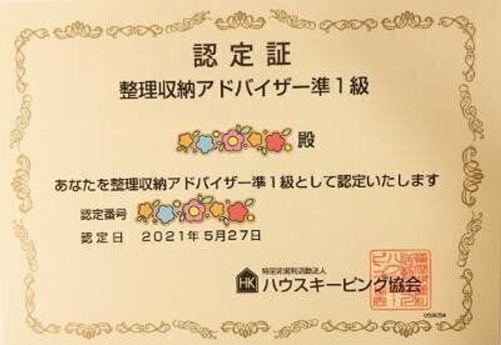 現在準一級まで取得している「整理収納アドバイザー」の資格。
