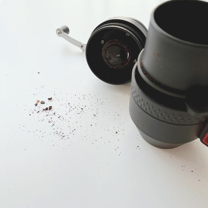 そして、この粉の散らばり。他のミルでも「あるある」ですが、豆を挽くときに弾け飛んだ豆の破片や、カップからミルを取り外した時は粉がこぼれます。