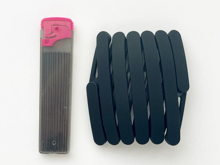 どのくらいコンパクトなのかをお伝えしたくて、シャープペンシル芯のケースを横に置いてみました。ものすごぉ~く小さいの、伝わりますか?両手で挟むと見えなくなるサイズです。