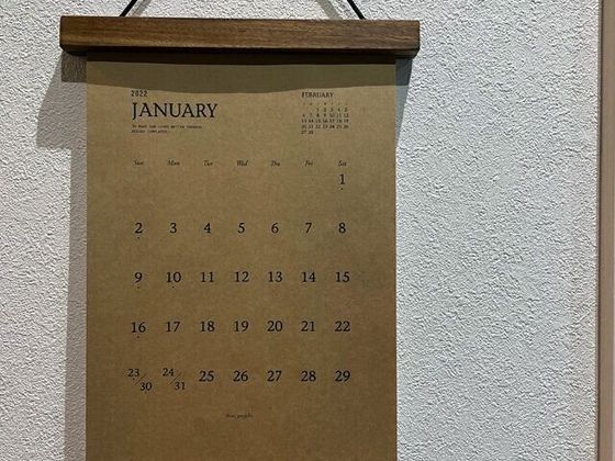 インターネットにて、著作権フリーで使えるカレンダーをみつけました!そのデザインが気に入り、大きさもA4サイズで十分なため「印刷すればいいんだ!」ということに気づき、去年からはそちらを印刷したものを飾っています。パソコンもプリンターも自宅にあるので、用紙さえ用意すればOK。両面印刷機能を使えば、6枚で済むというさらにミニマル思考にピッタリ。我が家では予定は夫婦ともにスマホ内のアプリで管理しているため、カレンダーに書き込むということはほとんどありません。時々家族のお誕生日やちょこちょこっと予定を書き込む程度です。オシャレなデザインのものを選びました。