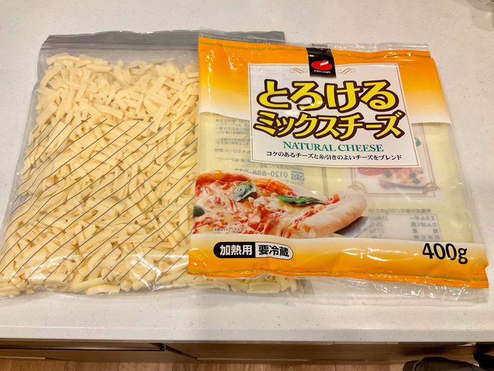 ピザ用チーズは冷凍保存が可能なジッパーバッグに移しかえ、平らにして空気を抜いて冷凍保存します。