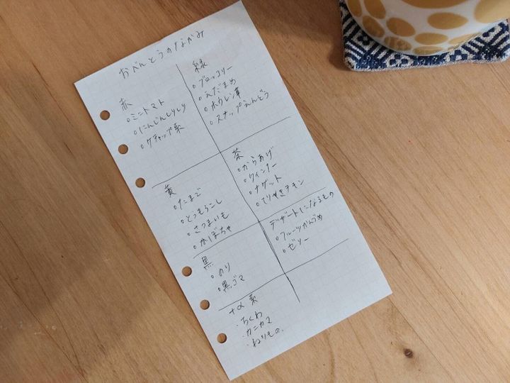 実際にお弁当の買い出しに行く前に色別おかずのリストを作って下準備にしました。