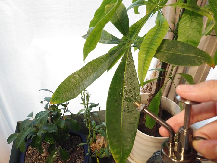 水やりはとは別に葉っぱを潤すようにシュッシュッシュッと霧吹きで葉水をしましょう。葉水をすることで葉の乾燥、害虫、ほこりや汚れの予防になります。