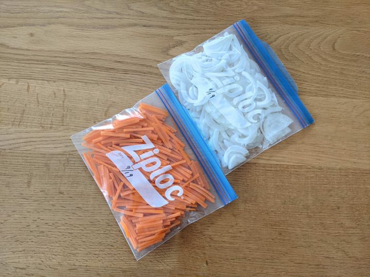 我が家の定番野菜である玉ねぎ、にんじん、キャベツなどは多めにカットしてジッパー付きポリ袋に。空気を抜くようにして袋を閉じ、野菜が重なりすぎないように袋全体に分散させながら平らにして、冷凍庫へ。