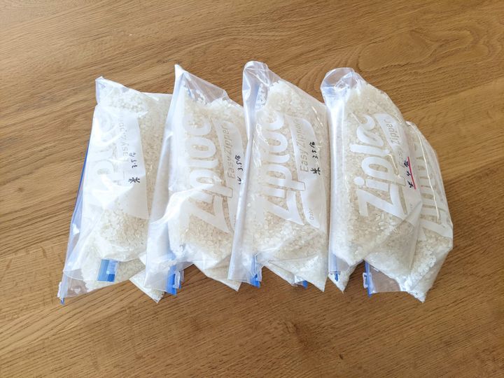 洗う手間を軽くするため我が家はもっぱら無洗米派です。5Kgを購入したら、まず3.5合ずつジッパー付きポリ袋に分けてしまいます。(2袋は4合強になるので、丼ものやカレーなどご飯多めのメニューの時に使用します。)