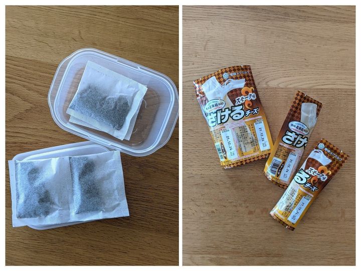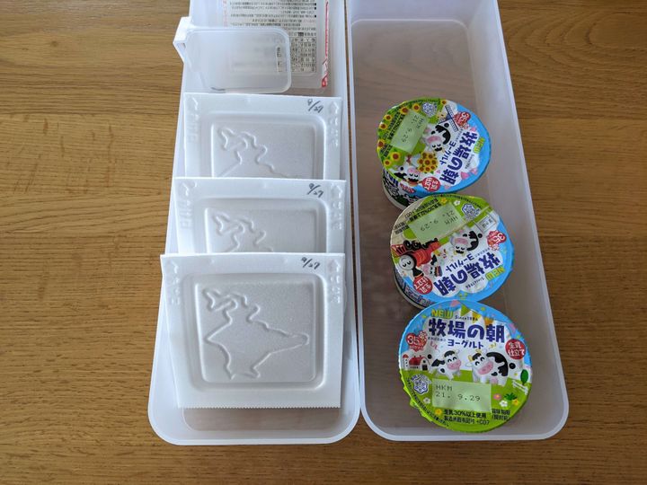 納豆や豆腐、ベーコン、ヨーグルトなど複数をまとめているフィルムなどは外し、冷蔵庫に立てて収納。賞味期限が見えるように置くと期限内に食べきる意識がもてます。チーズ・麦茶パックなど切れ目が入っているものもバラしておきます。