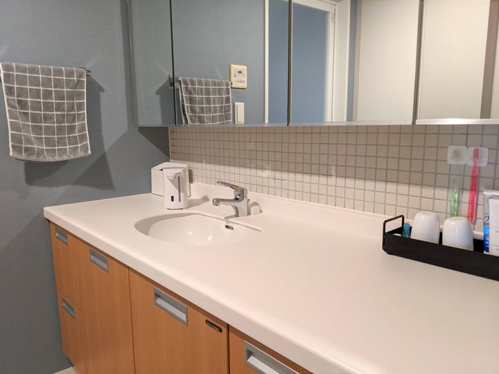 まず、洗面台の上にあるものを別の場所(洗濯機上)に移動させ、掃除しやすい状態にします。掃除にはメラミンスポンジを駆使。スポンジに水を含ませ、鏡全体を軽くこすった後、スクイージーで水気を取り除きます。(我が家の鏡はくもり止めなどの表面加工はされていないためメラミンスポンジを使用しています。)