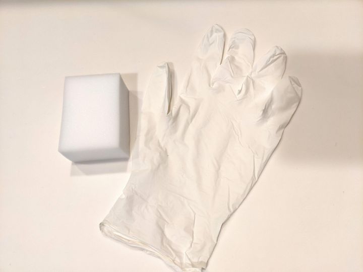 そのあと、洗面所掃除で使ったメラミンスポンジで手洗い器と便器の中をこすり洗い。手袋をはめて中までしっかり洗います。使い終わったスポンジは、持ったまま手袋を裏返して外せば、汚れに触れずに捨てられます。