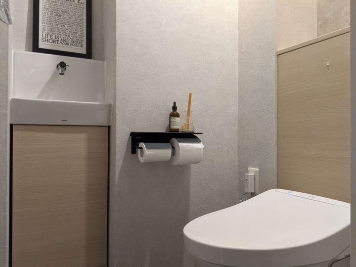 とあるCMによるとトイレの壁や天井にはニオイの元が飛び散っているとのこと!それは恐ろしい…ので、天井や壁、扉を拭くところから始めます。続いて棚まわり、便座まわりを拭きます。