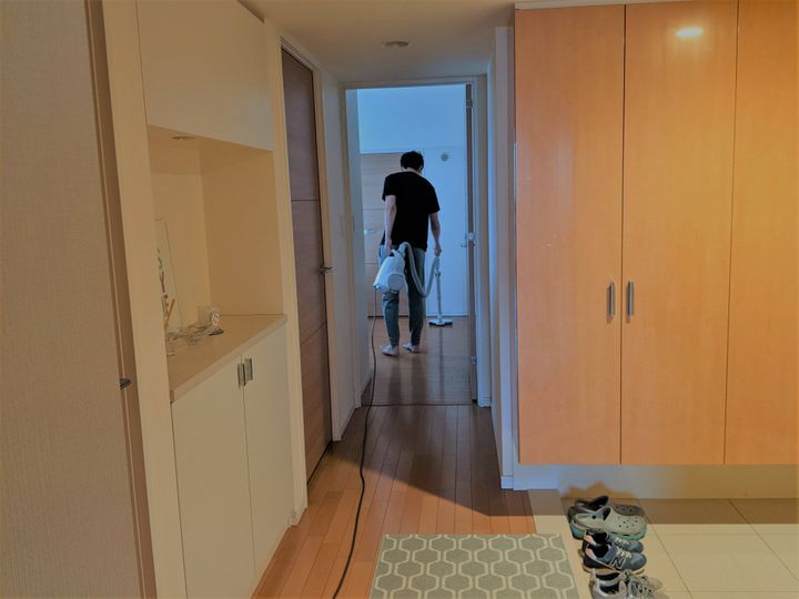 夫は私よりも細かい作業が得意。週末には家全体の念入りな掃除機かけをお願いしています。すべての部屋のすみずみまで丁寧に。例えば、洗濯機と壁の間の隙間や玄関も掃除機のノズルを変えてホコリやごみを吸い取ります。さらに、テレビ台や本棚などの上を拭き掃除して終了です。