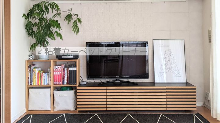 すぐ手に取れる位置に粘着カーペットクリーナーを。ラグや洋服についたホコリなど、コロコロします。テレビ台の中にはほこり取り用のワイパーも入っています。