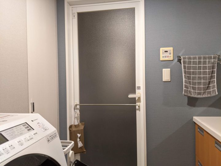 洗面所の収納の中には掃除用シートがあるので、床やお風呂の扉まわりなどの汚れが気になるときに使用。また、毎日お風呂のあとに髪の毛を捨てる作業が面倒にならないよう、扉にティッシュをかけています。