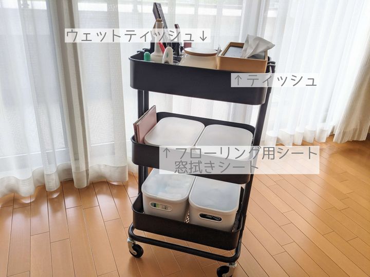 ダイニングテーブルの横に置いているワゴンには、ティッシュやウエットティッシュ、掃除用のシートを入れています。ウエットティッシュは台ふきんとしても活用。