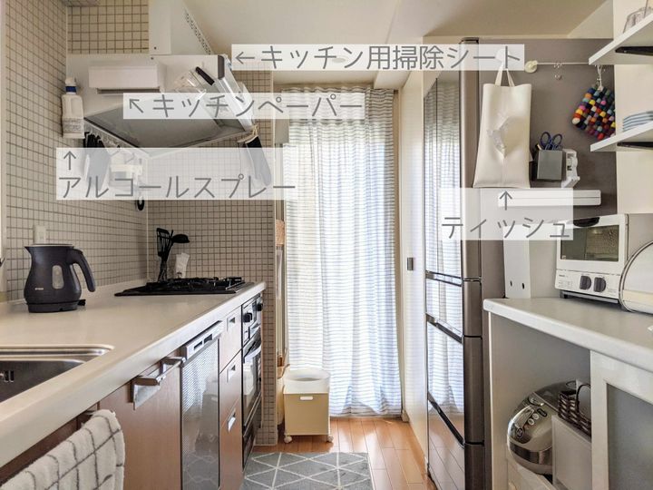 キッチンでは汚れの度合いに応じてティッシュやキッチンペーパーを使い分けています。一日の終わりには、換気扇の上にこっそり?置いているキッチン用掃除シートで作業台やシンクまわりを拭いて片付け完了です!
