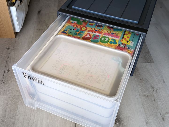 我が家では、家で描いた絵や折り紙などを保管する一時保管ケースと、園や学校で製作した作品や長期的に残しておきたい思い出アイテムを収納する大きめの衣装ケース1つを用意。