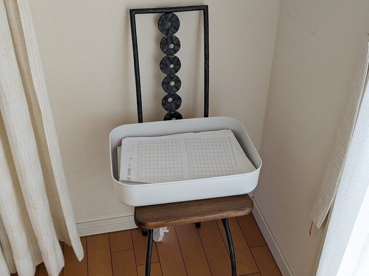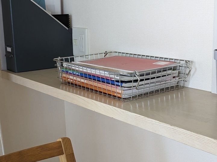 子どもがお絵描きした紙、工作グッズ、プリントやテキスト、私のノートや読みかけの本など…ついつい放置しがちなものを入れる収納ケースを用意し、散らかりやすい場所の近くに置いています。