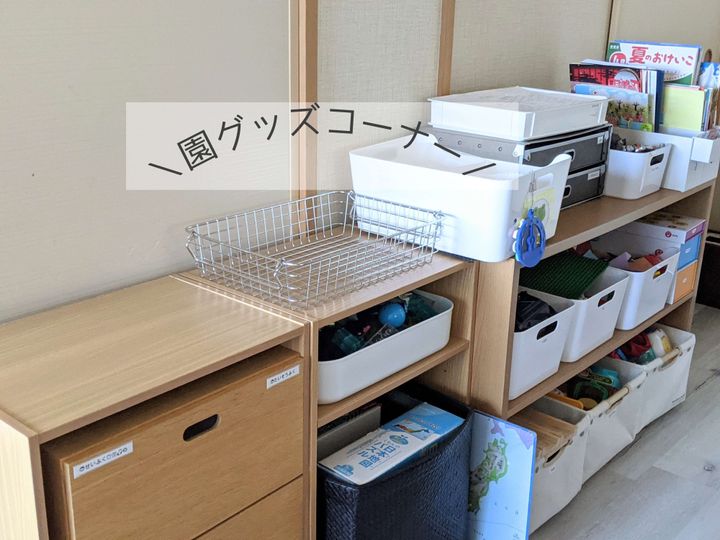 本当はスッキリした見た目が好みですが、息子が簡単にできる仕組みづくりを優先。帰宅後多くの時間を過ごすリビングの横にある部屋に、出しっぱなしOKの園グッズコーナーを設けています。