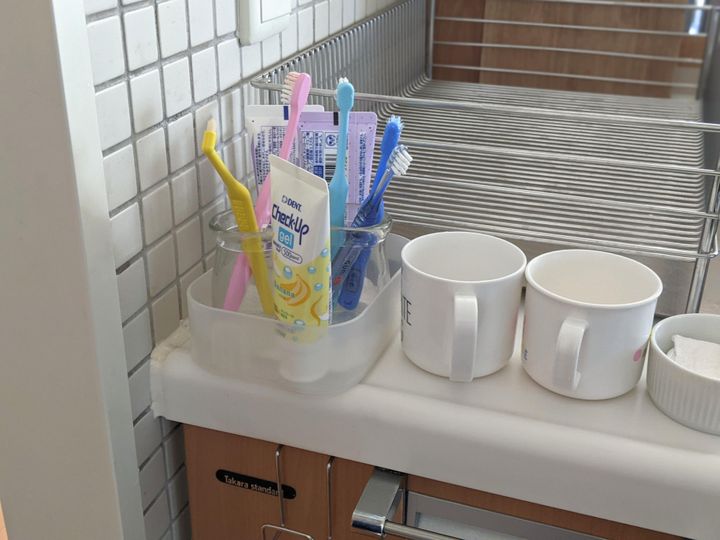 歯磨きを始めた当初、私が歯ブラシを取りに行く面倒くささを解消するため、キッチンの入り口近くに子どもの歯ブラシ置き場を作ってから、今でもそこが定位置です。