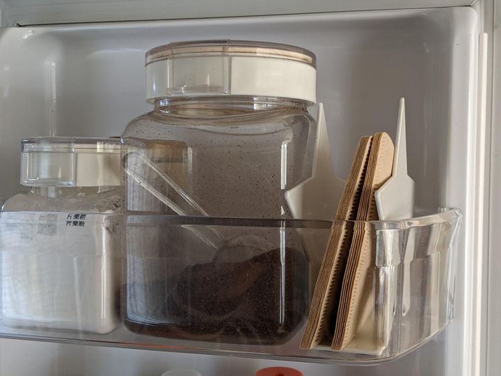 牛乳はもちろん、コーヒーの粉も冷蔵庫で保存しているため、冷やす必要はないのですが一緒にペーパーフィルターも置いています。一度冷蔵庫を開ければ3点セットを取ることができて便利です。