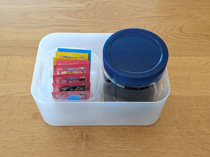 子どもたちはそれぞれその日の気分でご飯のお供を決めていて、同じものを選ぶことがほとんどありません。冷蔵ものではないふりかけと味のりはセットでケースに入れるようにしてから、子どもたちがケースごと食卓に運んでくれるように。母は何度も取りに行く手間が省けてラクになりました。