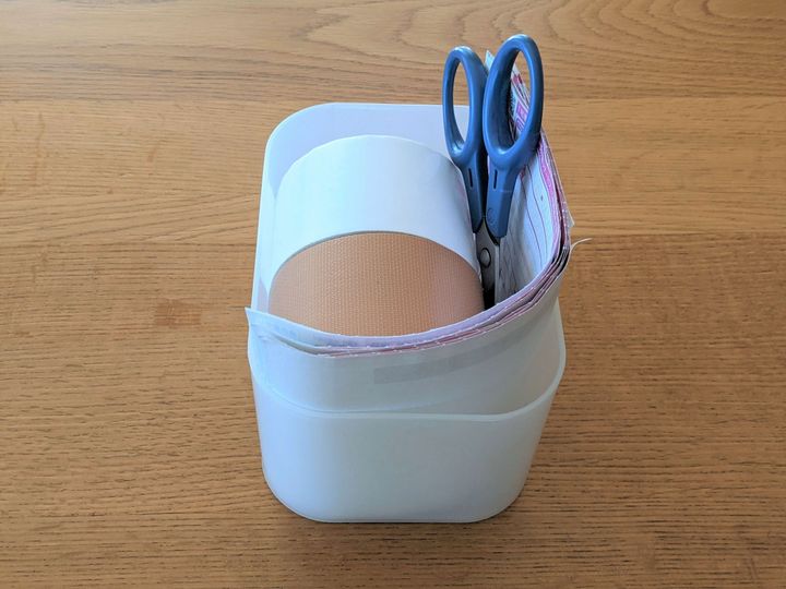 荷物を送るときに使うガムテープ、送付状、ペン、はさみをセットにして収納しています。ケース持って移動すれば、どこでも作業が可能。宅配セットの近くには緩衝材も少し保管しているので、必要であればすぐ準備することができます。