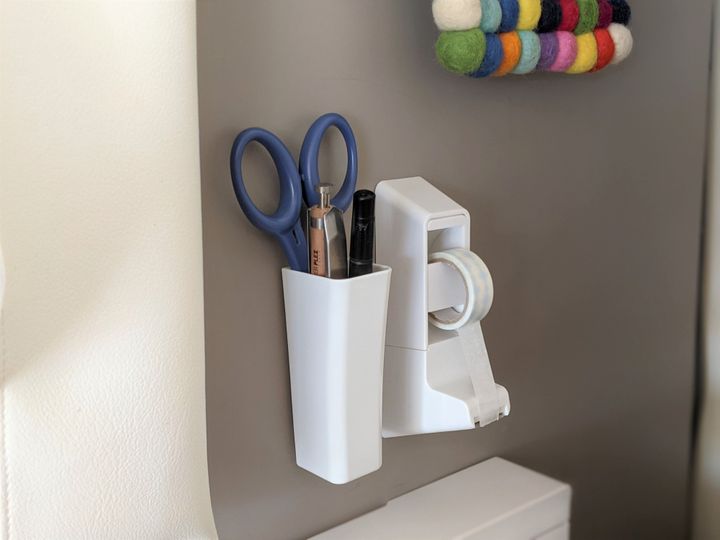 つくり置きを保存容器に入れるときは、つくった日付をマスキングテープに記入し、ふたにペタッと貼っておくようにしています。そこで、書きたいときにすぐに行動に移せるよう、マスキングテープとペンは冷蔵庫の横にセット置きしています。