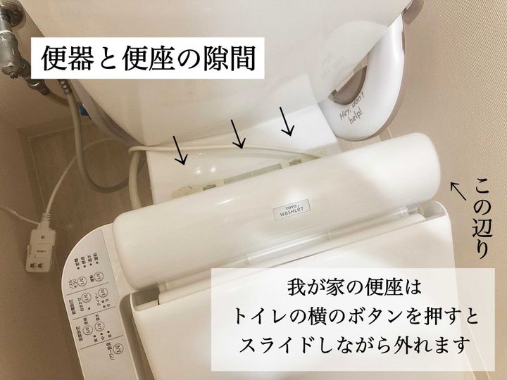我が家の便座は、トイレの横にあるボタンを押しながら便座をスライドさせるように動かすと取り外すことが出来ます。