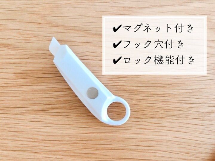 マグネット付きなので冷蔵庫や玄関扉など、どこでもペタッとくつけられるし、またフック穴があるので、マグネットがつかない場所でも引っ掛けて収納することが出来ます。