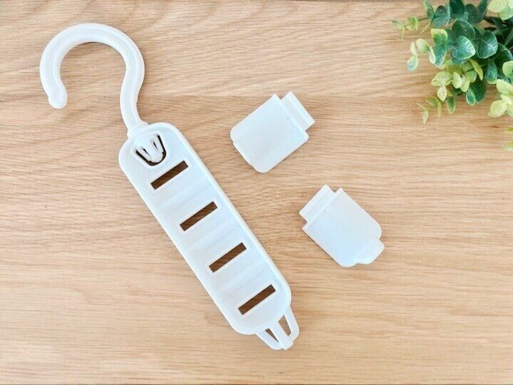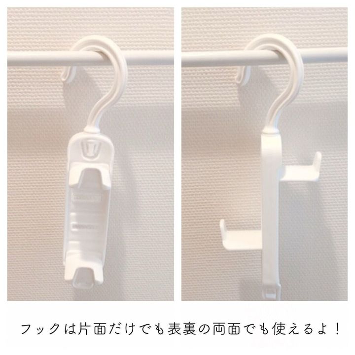 この付属のフックをハンガーの好きな穴の場所に付けて使います。