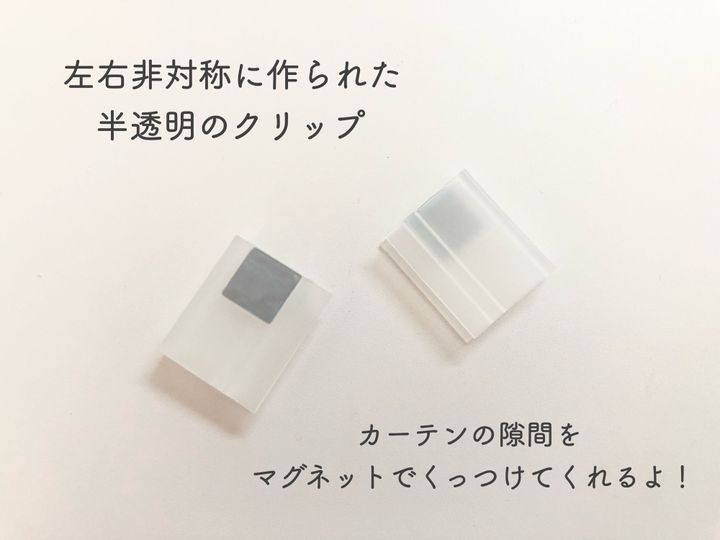 こちらの「カーテンの隙間防止クリップ」は、左右非対称に作られたマグネット付きのクリップです。